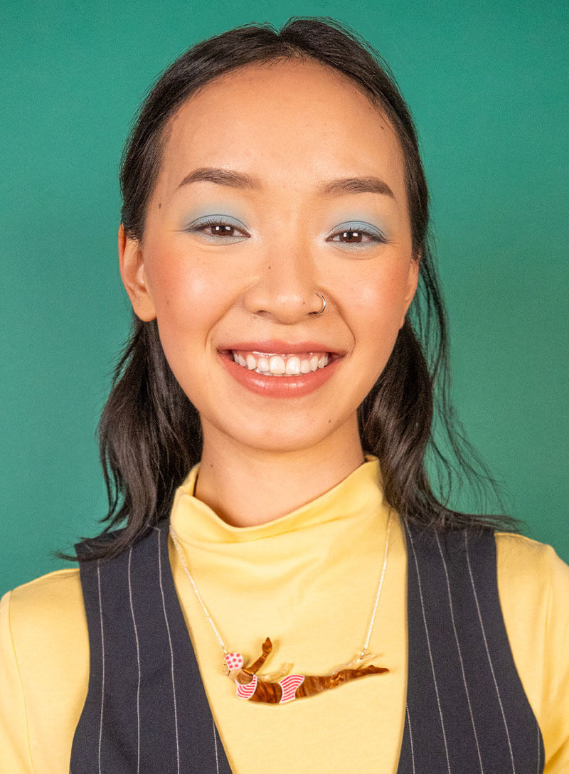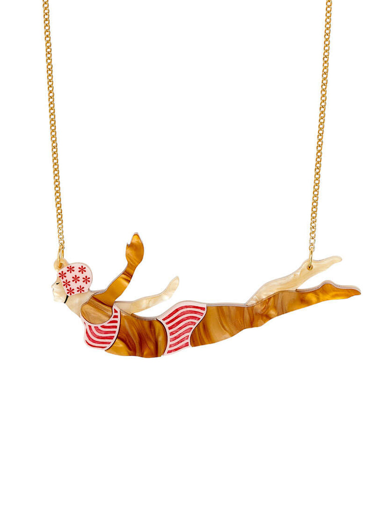 From Hampstead Heath Ponds to Beckenham Place Park: dive in with our Wild Swimmer Necklace. We’ve captured the joy of ‘taking a dip’ with a vintage diving lady laser cut in swirling tortoiseshell and marble “cream” acrylic. Ready to make a splash in a matching hand-inked pink bikini and swimming cap, our swimming-inspired jewellery is best paired over colour-pop brights.