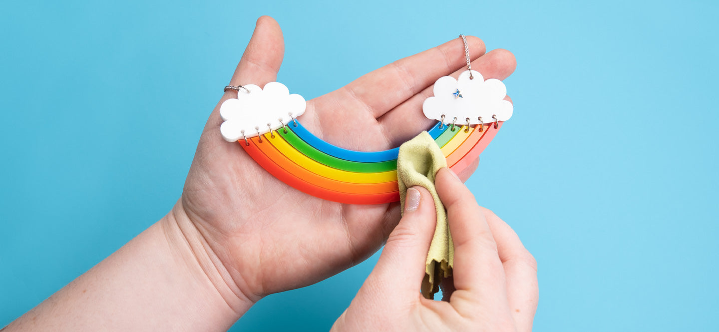 We recommend using a soft cloth (your sunglasses cloth for example) to clean the acrylic of your jewellery.