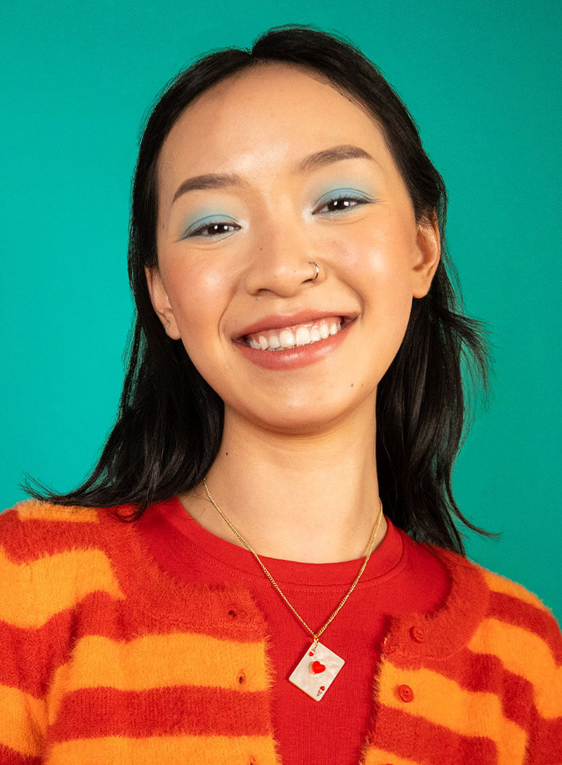 Alice In Wonderland enthusiasts to go-to gamers: play your Ace of Hearts Card Pendant close to your chest. We've created the must-have playing card necklace for fun styling in swirling white pearl acrylic. Adorned with a 3D glossy red heart and matching hand-inked details, this perfect gift for her is best layered over monochrome stripes.
