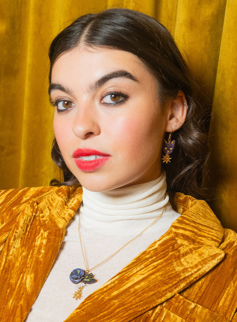 Animal jewellery goes galactic with our Astrologer’s Cat Necklace. Laser cut in a galaxy of swirling, glitter-flecked acrylic, our mystic feline curls up with a glittering celestial bloom and pearlescent crescent moon. Studded with a dazzling crystal star, this celestial cat accessory will add a touch of sparkle to any outfit. Just add matching Moon Charm Earrings!