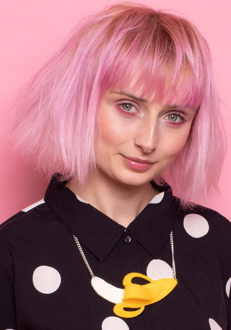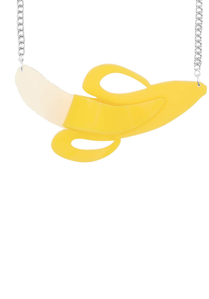 Dating back to 2011, the Banana Necklace nods to Andy Warhol's iconic Velvet Underground album cover. A bright colour pop yellow acrylic banana skin is carefully curved back by hand to achieve the perfect peeling effect. Etched and hand inked details add the finishing touch to this delicious necklace.