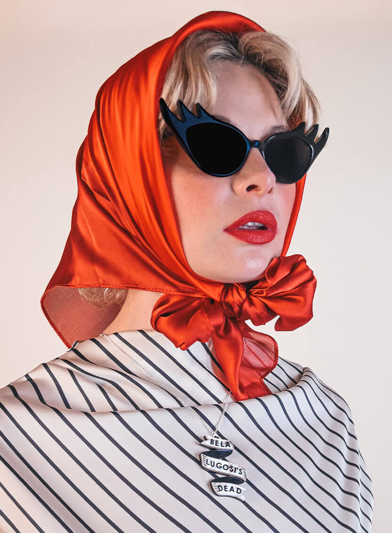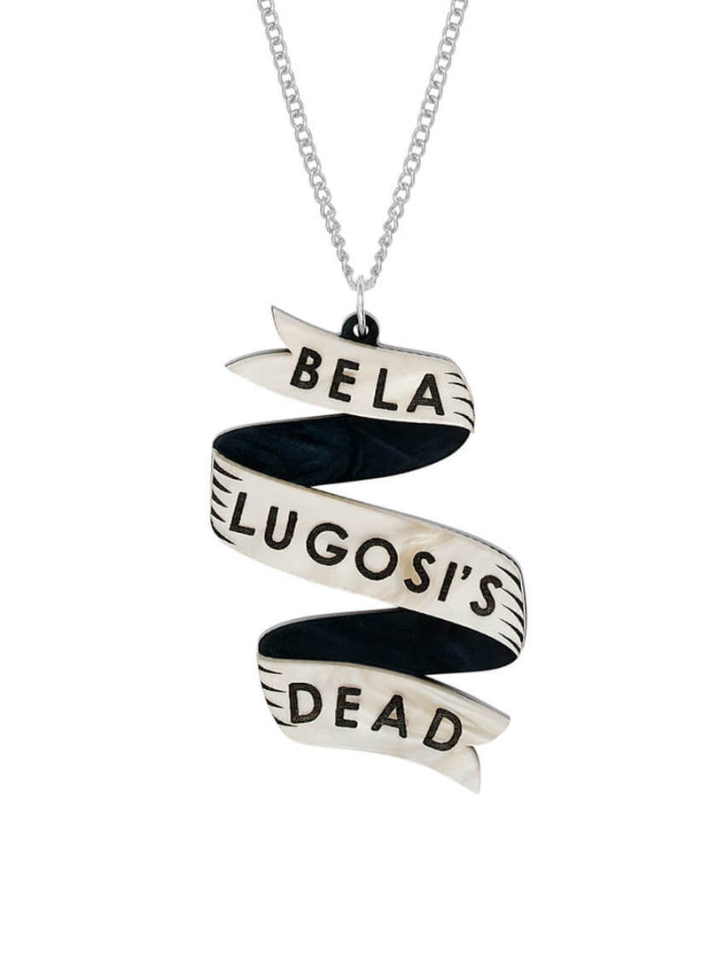 White on white, translucent black capes and our Bela Lugosi’s Dead Necklace. Inspired by Bauhaus’ ode to the Dracula actor, Bela Lugosi, channel the silver screen in a glossy recycled acrylic scroll.