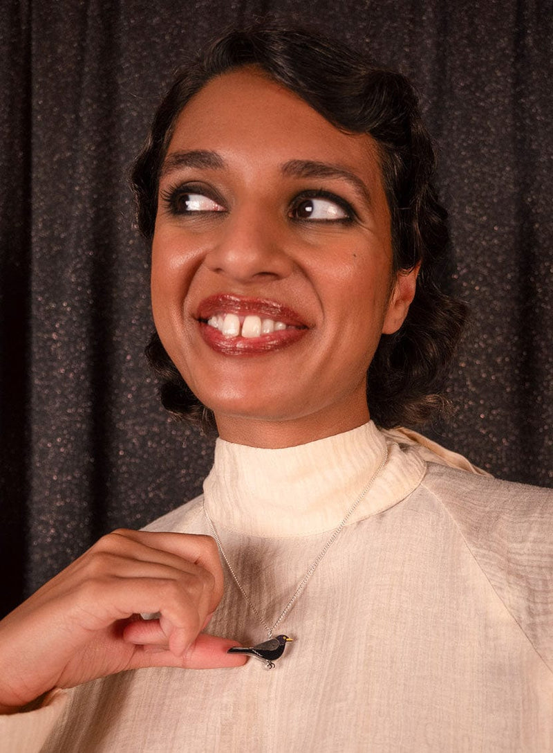 Aviaries meet accessories in our Blackbird Pendant. We've recreated a tiny feathered friend in shades of midnight black. Glistening in an array of glitter-flecked, smokey marbled and recycled laser cut acrylic: spot delicate feather details and a colour-pop yellow beak, laser etched and hand-inked by our expert makers. Suspended from an adjustable silver-plated chain, pair this mini bird jewellery with our matching Blackbird Earrings - that's gifts for bird watchers, sorted!