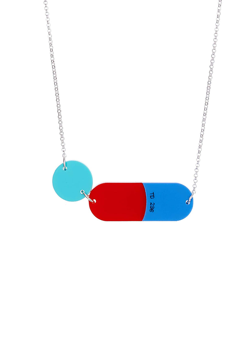 Help yourself to a dose of the Blue Pill Necklace: we've recreated an oversized capsule in laser cut in red and blue acrylic and paired it with a bright aqua pill, strung against a chrome chain.
