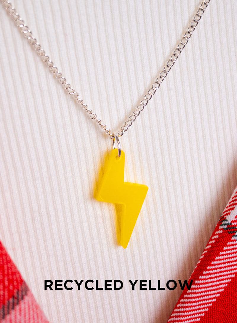 For wannabe wizards to rockstars: introducing our Bolt Charm Pendant. We've laser cut a layerable lightning bolt necklace in six striking shades of acrylic. Choose from glittering silver or gold dust, recycled yellow, colour-changing iridescent, black glitter and glow in the dark pink. All suspended from your choice of adjustable silver-plated or gold-plated chains, serve stormy looks with a pair of our Bolt Charm Earrings to match!