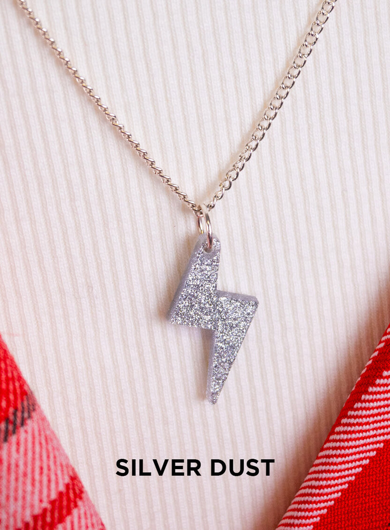 For wannabe wizards to rockstars: introducing our Bolt Charm Pendant. We've laser cut a layerable lightning bolt necklace in six striking shades of acrylic. Choose from glittering silver or gold dust, recycled yellow, colour-changing iridescent, black glitter and glow in the dark pink. All suspended from your choice of adjustable silver-plated or gold-plated chains, serve stormy looks with a pair of our Bolt Charm Earrings to match!