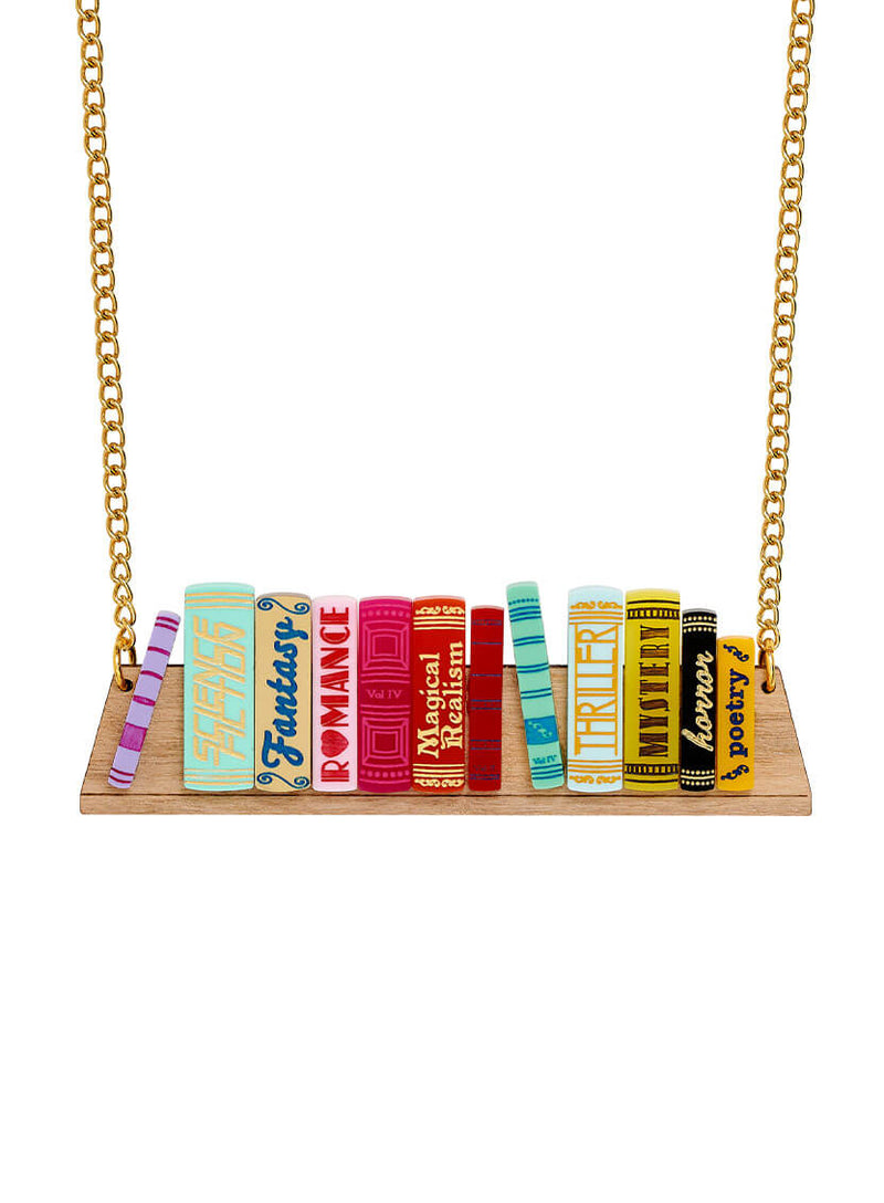Never be without your favourite book in our rainbow-splashed Bookshelf Necklace. Fully stocked: we’ve recreated a look into our bookcase with our favourite genres, laser cut in 12 shades of glossy bright-coloured acrylic. Sitting atop a walnut wooden shelf, are you reading Sci-Fi and Fantasy or a mix of Romance and Mystery?