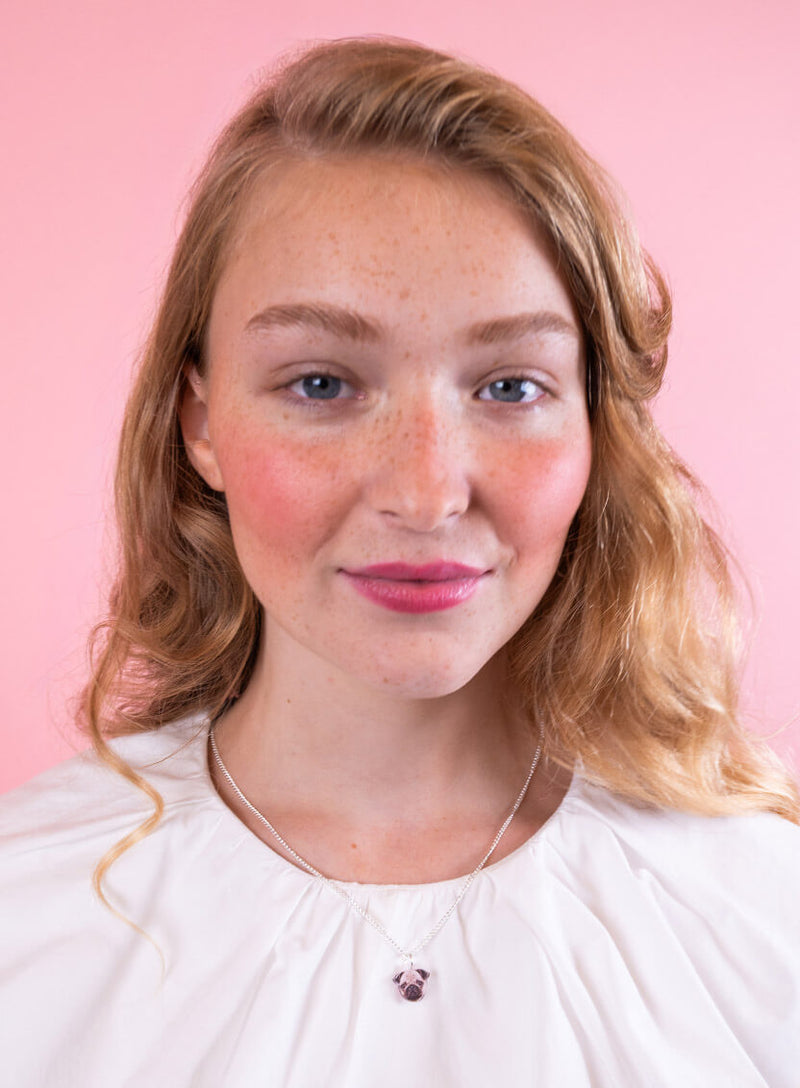 Miniature Pug necklace Original design, handcrafted in the UK Digitally printed details High-quality pearl-like adornments Hypoallergenic and silver-plated adjustable chain 100% made from recycled acrylic Presented in an eco-friendly gift box