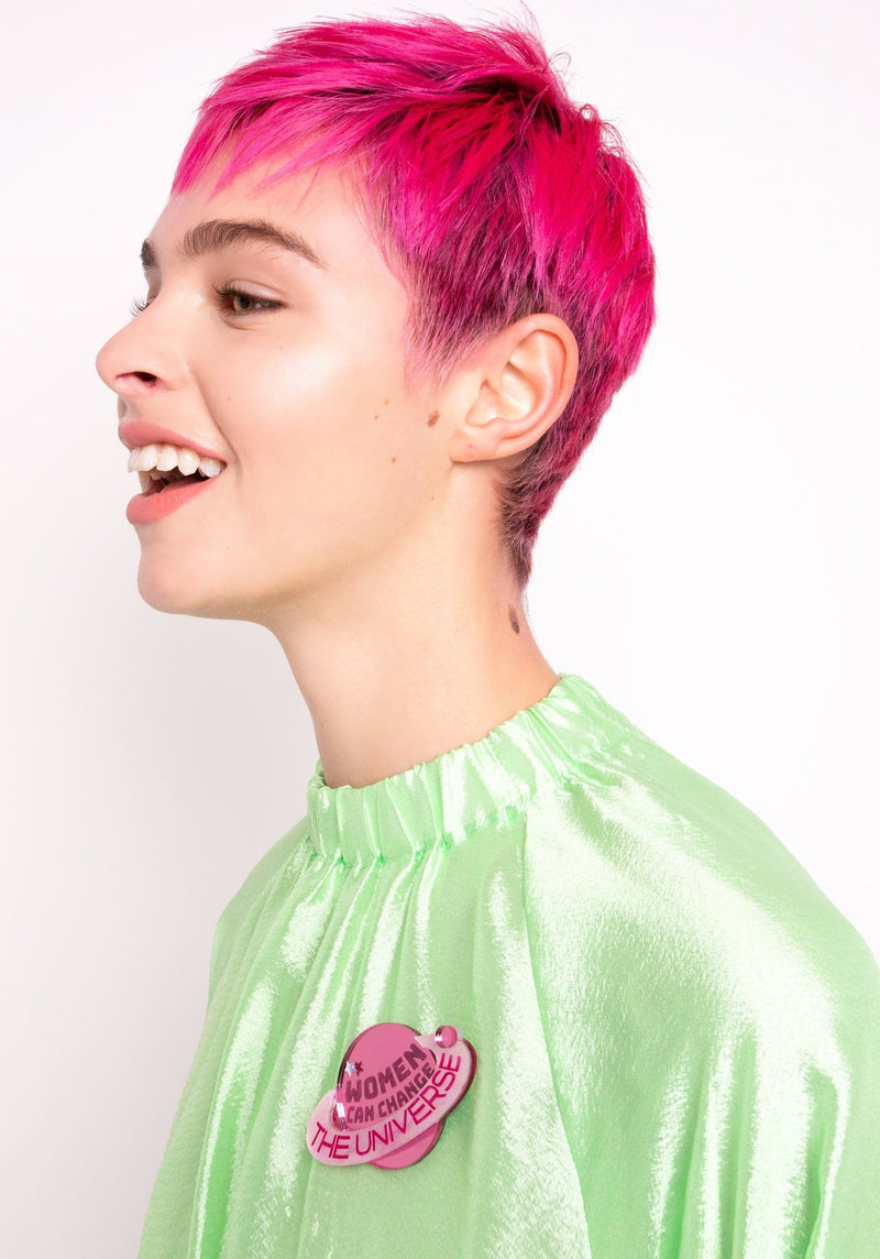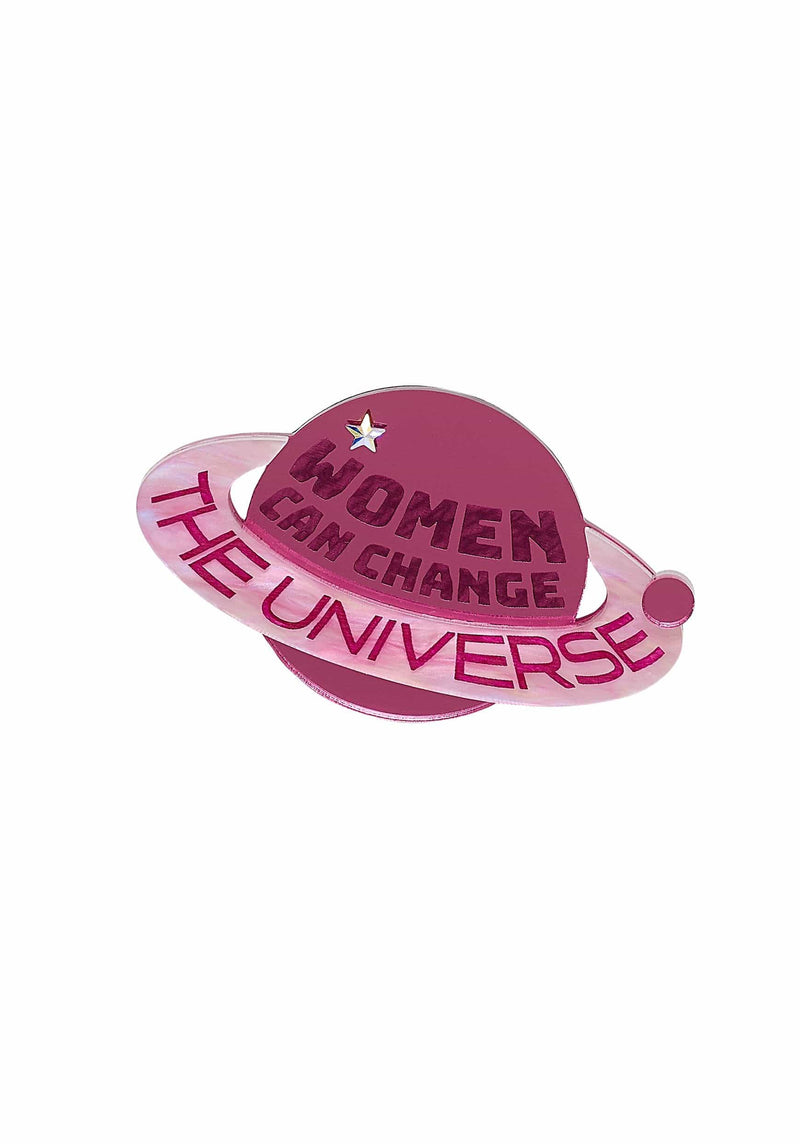 Did you know the first all-female spacewalk only took place as recently as October 2019? Inspired by the vital contribution of women in STEM, take up space in the Change the Universe Planet Brooch. Laser-cut in glossy pearlescent acrylic, this statement ringed sphere is etched and inked to bear the missive, "women can change the universe", whilst a miniature crystal masquerades as a tiny star in orbit.