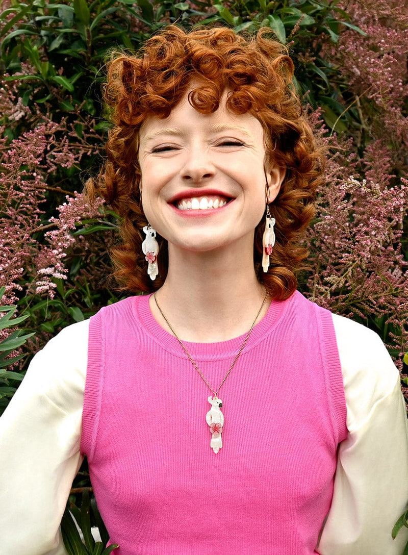 Tweet all about it with your new friends: the Cockatoo Earrings. Dressed to impress, this perfect pair are laser cut in layers of shimmering white and ivory pearl acrylic, adorned with glistening pink Hibiscus flowers and suspended from hypoallergenic gold-tone hooks. Stop looking: the perfect pair of summer earrings are right here!