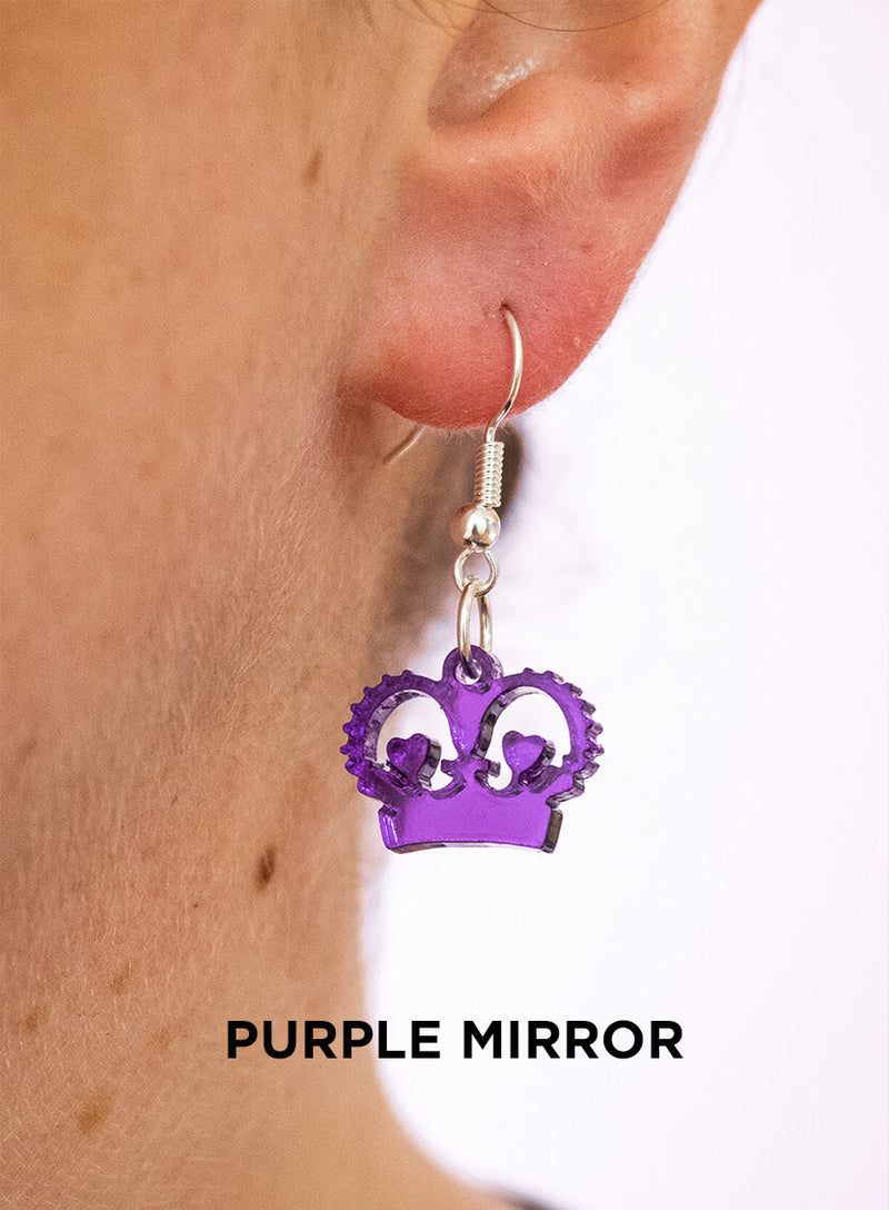 Calling all Kings and Queens, rule in our Crown Charm Earrings. Laser cut from acrylic by our team of expert makers, this pair of miniature crowns are your go-to subtle statement. Twinkling in sparkling silver dust or shining with gold or purple mirror? These tiny tiaras are suspended from your choice of hypoallergenic silver -plated or gold-plated hooks. Why not make it match your personalised Name Necklace for a look fit for a coronation?