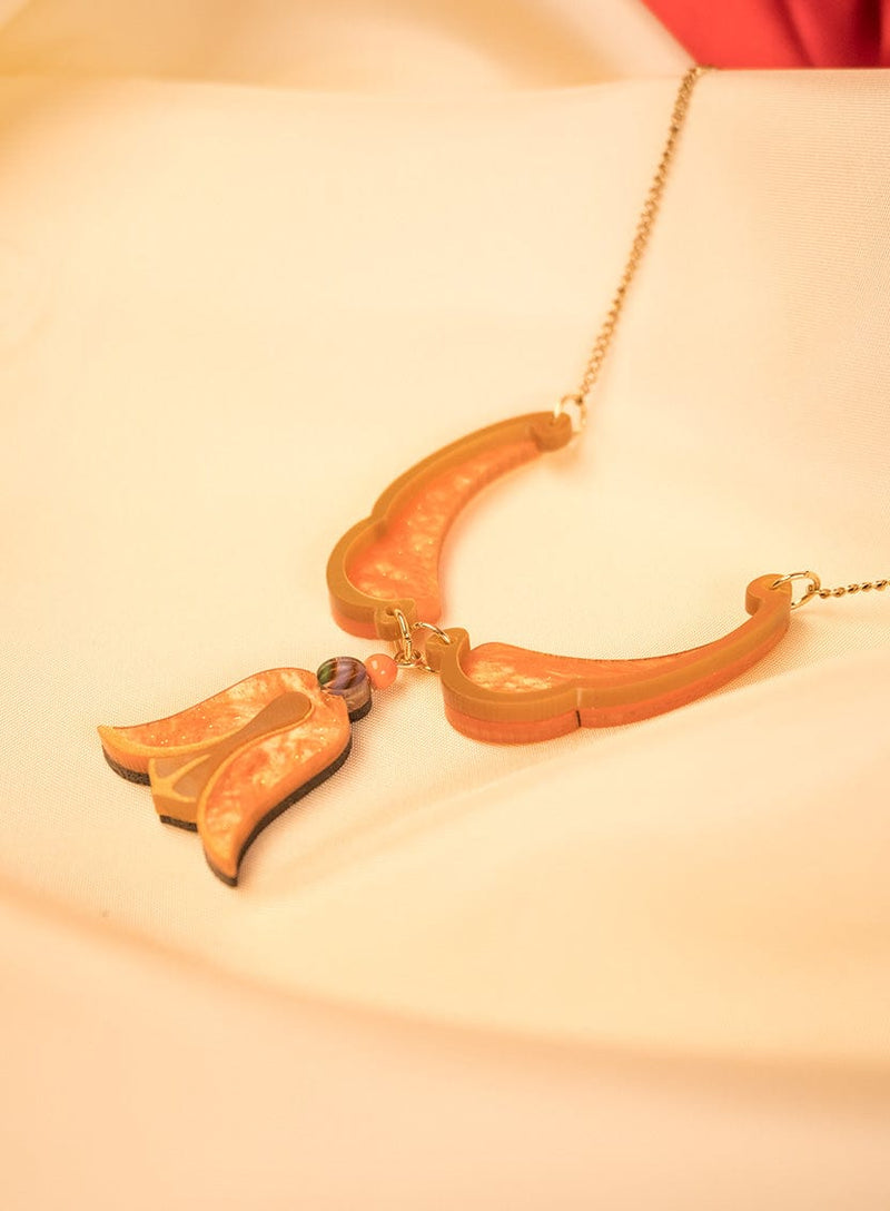 Make your monarchal mark in the Crown Imperial Flower Necklace. Pairing the beauty of the Royal Pavilion’s abundant flower garden with its elegant interiors, the coving of The Long Gallery provides the inspiration behind this paramount perennial. Laser cut in ornate gold-flecked orange acrylic, our bell-shaped floral centrepiece is delicately interlocked with a frosted peach-tone stamen complete with etched detailing. Framing this wood-backed flower are stylised swoops embellished with architectural gilded details leading towards an adjustable gold-tone chain.