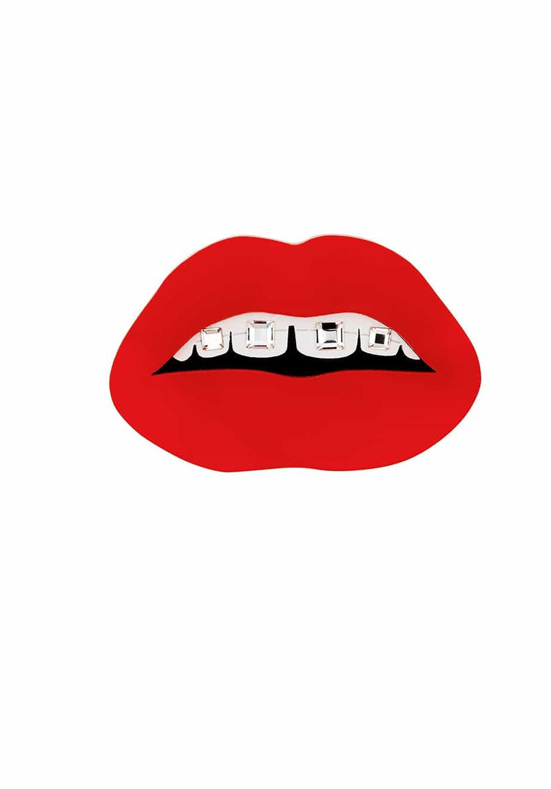 Kiss and makeup with the Dental Bling Brooch. Swarovski studded pearly whites peek out from pouting red acrylic lips. Pucker up!