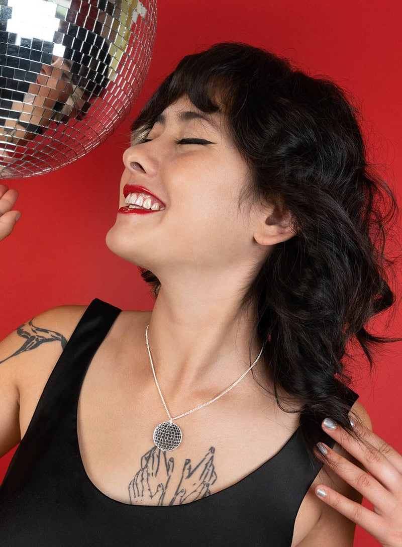 Dance floor divas, take our Disco Ball Pendant for a spin. We’ve recreated a pint-sized mirrorball in silver mirror acrylic. Creating an illusion: grid-like etched details make this 2D disk look just like the real thing. The ultimate layering piece: layer with any everyday chain to keep the party going.