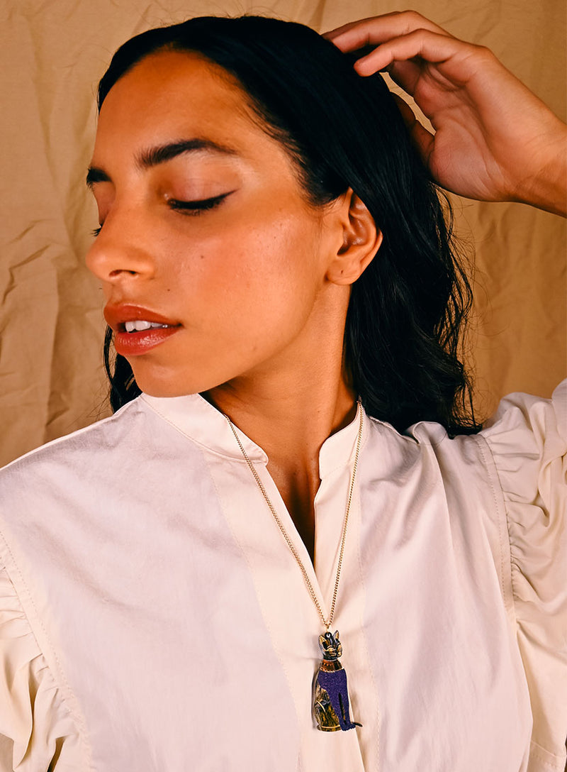 Bow down to our Egyptian Cat Necklace. Laser cut in shimmering midnight-black acrylic with hand-inked golden details, this regal feline is robed in a glossy gold collar. A symbol of protection, grace, and feminine power, style over bold jewel tones for a look that’s pure majesty.