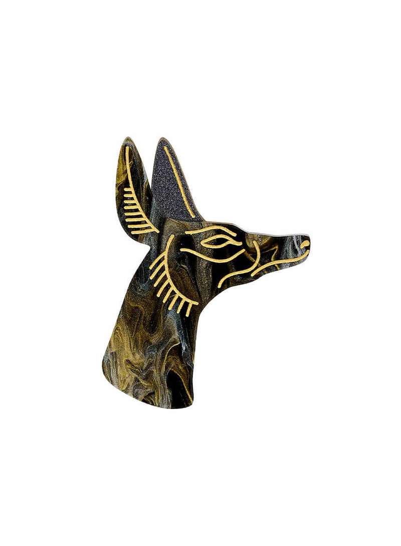 Step into the shadows with the Egyptian Jackal Brooch. Capturing the sleek, regal profile of Anubis, the guardian of tombs, swirling black acrylic is laser-etched and hand-inked with golden details that echo hieroglyphic artistry. Ears pricked and powerful, pin on your lapel for divine authority.