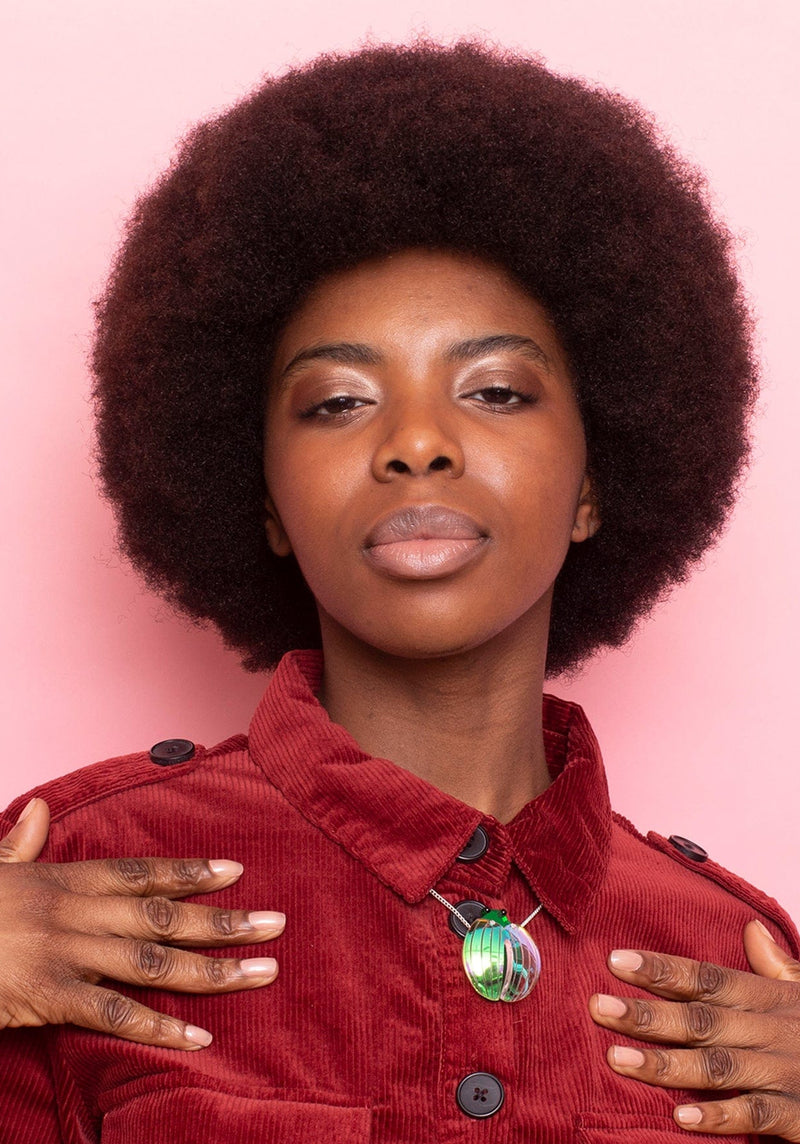 Gotta crawl, gotta crawl... No ugly bugs in sight: our Beetle Brooch's iridescent acrylic wings are hand curved and pinned to its emerald mirror body for glossy, entomological realness! Suspended from an adjustable, silver-tone chain, this beetle is best worn against racing stripes for plenty of room to scurry!