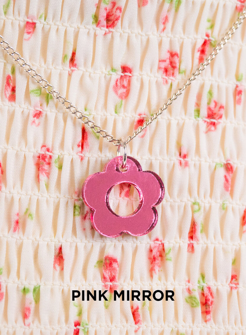Pick your posy with our Flower Charm Pendant. We've laser cut an easy-to-wear flower necklace in four super cute shades of acrylic. Perfect for nailing girly aesthetics to go-to gifts for girls: choose from lustrous white pearl, glossy pink mirror, colour-changing iridescent and dazzling teal pearl. All suspended from your choice of adjustable silver-plated or gold-plated chains, serve flower power with a pair of our Flower Charm Earrings to match!