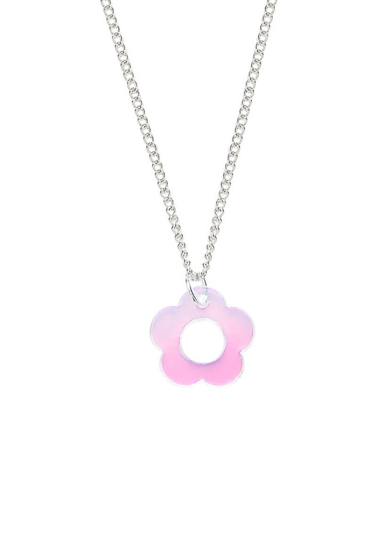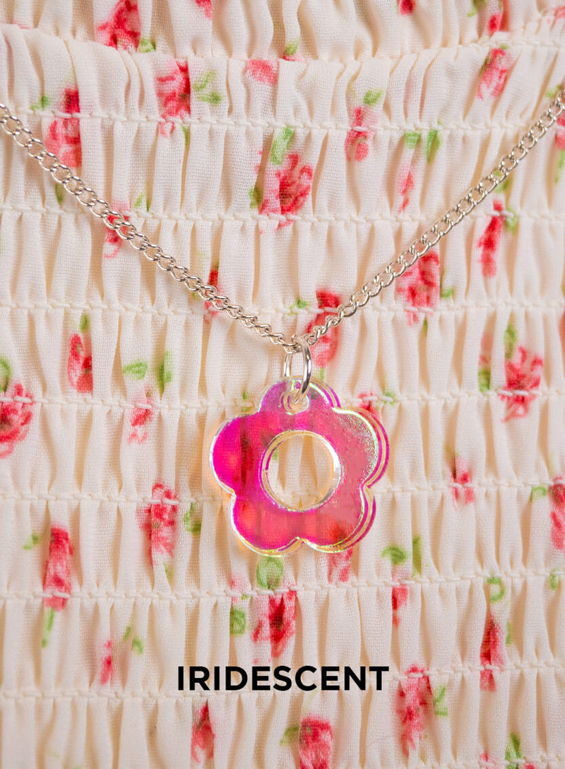 Pick your posy with our Flower Charm Pendant. We've laser cut an easy-to-wear flower necklace in four super cute shades of acrylic. Perfect for nailing girly aesthetics to go-to gifts for girls: choose from lustrous white pearl, glossy pink mirror, colour-changing iridescent and dazzling teal pearl. All suspended from your choice of adjustable silver-plated or gold-plated chains, serve flower power with a pair of our Flower Charm Earrings to match!