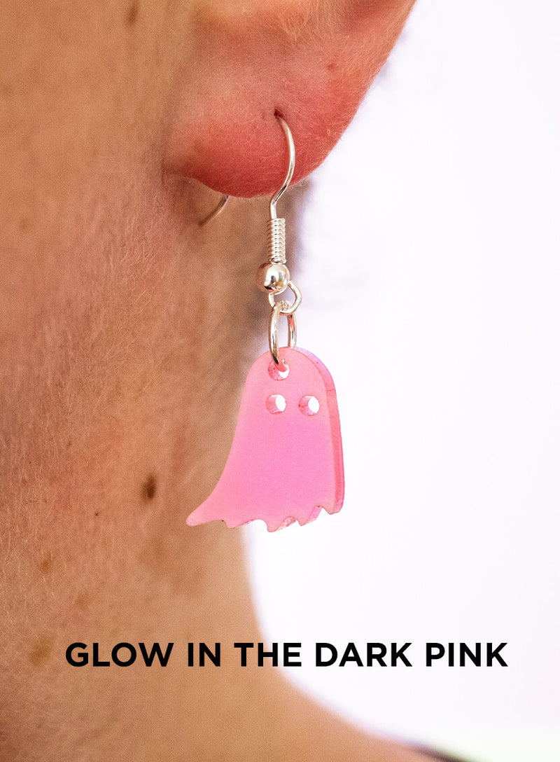 Make it match with your best ghoul friends in our Ghost Charm Earrings. It’s spooky season all year round with scarily cute spooks laser cut in three shades of acrylic… will it be white white pearl, colour-changing iridescent or glow in the dark pink? Choose to float these tiny apparitions from either silver -plated or gold-plated hypoallergenic hooks, this is perfect pressie for scary movie fanatics. Boo!