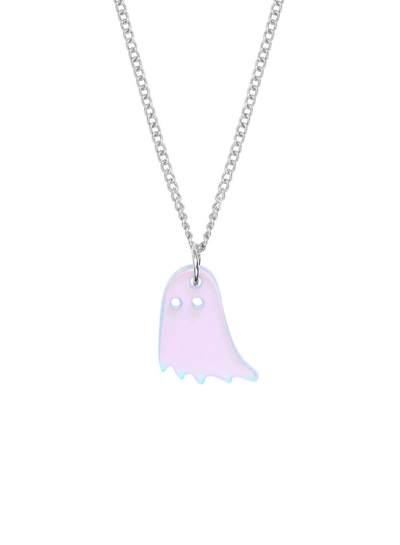 Serve spooks in our Ghost Charm Pendant. Scarily cute, we've laser cut a mini ghoul necklace in three shades of glossy acrylic. Choose from these creepy colourways: colour-changing iridescent, lustrous white pearl and glow in the dark pink. All suspended from your choice of adjustable silver-plated or gold-plated chains, shop spooky jewellery sets and pair with our coordinating charm earrings.