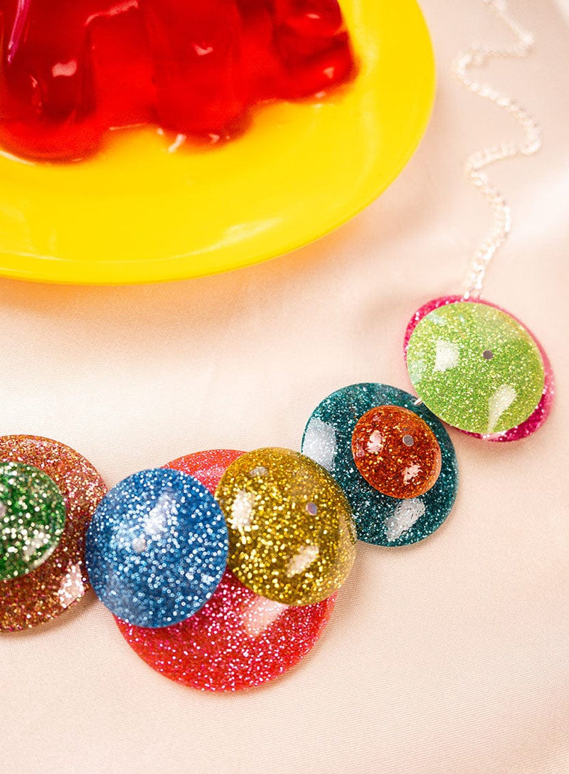 The search is over: meet your dream statement necklace! Get set to sparkle with our versatile Glittering Orbs Necklace. Abstract Christmas-bauble-cool meets chic spheres, laser cut in a jewel-toned palette of glitter acrylic from hot pink to twinkling teal. Each orb has been delicately hand curved and assembled by our team of expert makers, linked together and suspended from an adjustable silver-plated chain. This rainbow going out necklace is party season’s dopamine dressing essential: just pair with oversized sleeves and puffy metallic dresses.
