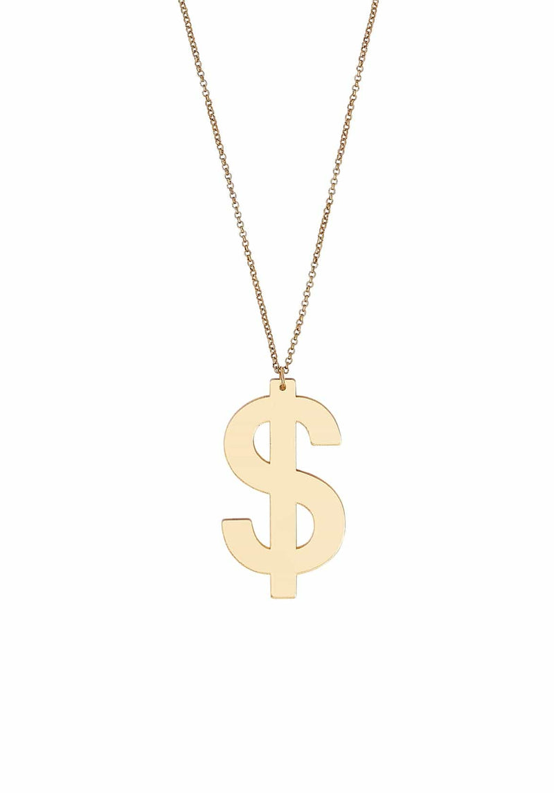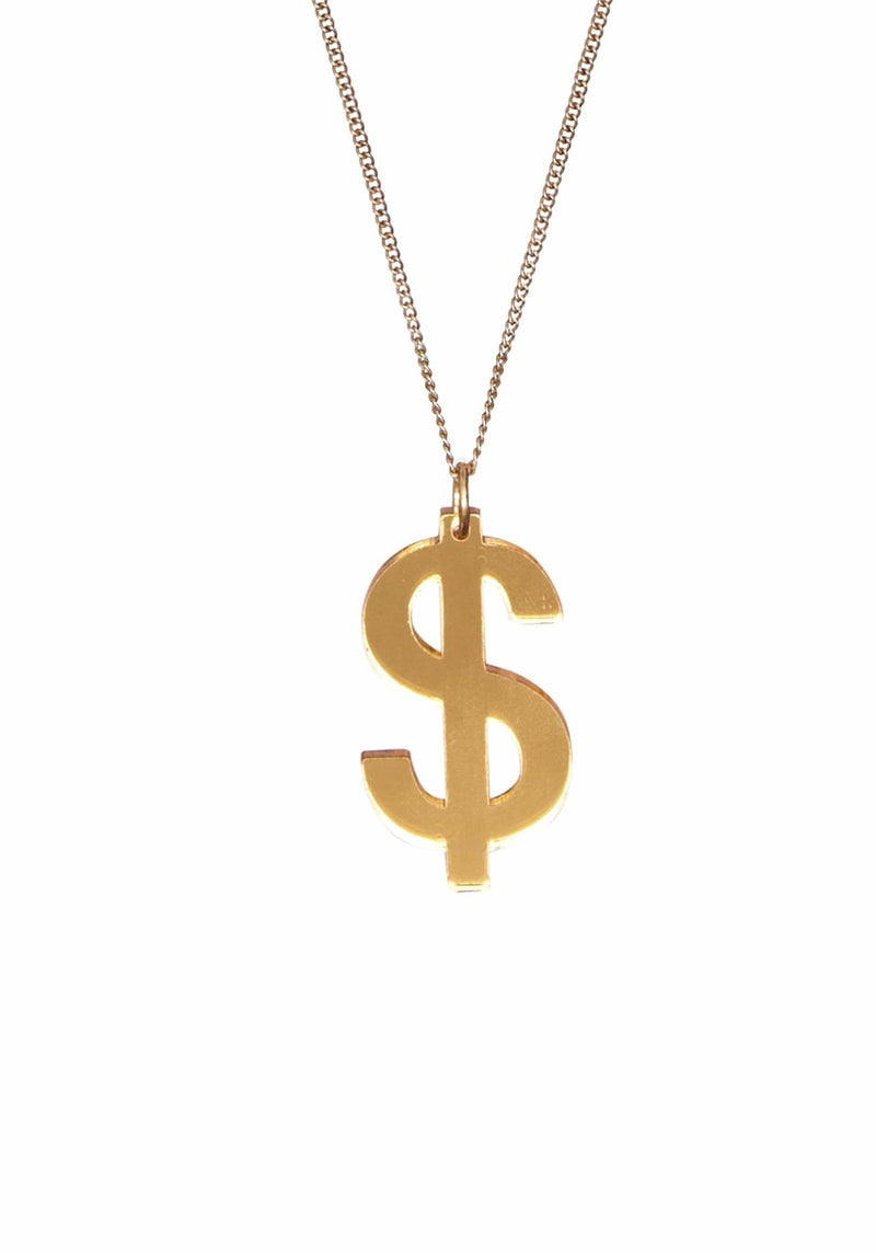 Pick up the Golden Dollar Necklace. We've recreated a pop art dollar sign in glossy mirror gold acrylic, suspended from an adjustable gold tone chain.