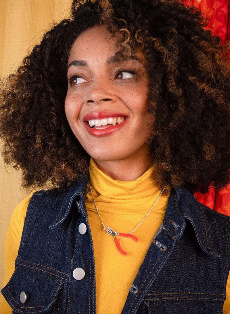 Take a style tip from the Tatty Devine studio with our clever Jewellery Making Pliers Necklace. We’ve recreated our go-to tools in recycled red and glossy silver mirror acrylic, layered over recycled transparent laser cut acrylic for comfy wearing while you craft. Suspended from an adjustable silver-plated chain, pair this must-have necklace for makers over graphic tees and statement overalls.
