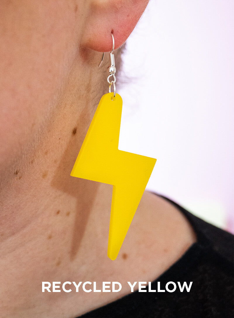 Strike lucky in our Large Bolt Charm Earrings. Ready to kick off celebrations, we’ve laser cut a pair of go-to party earrings in six acrylic shades, all suspended from your choice of silver-plated or gold-plated hooks. Choose from glittering silver and gold dust, recycled yellow, iridescent, black glitter, and glow in the dark pink. The perfect partner for sequin frocks, we’ll see you on the dancefloor!