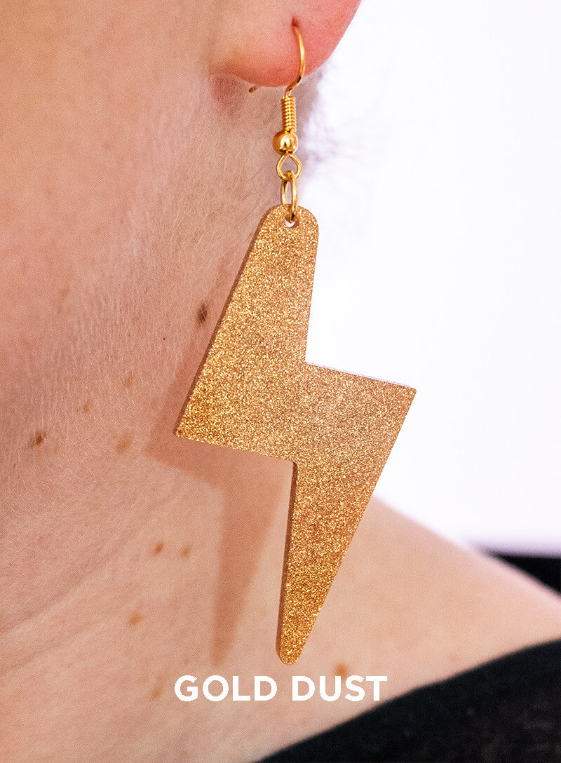 Strike lucky in our Large Bolt Charm Earrings. Ready to kick off celebrations, we’ve laser cut a pair of go-to party earrings in six acrylic shades, all suspended from your choice of silver-plated or gold-plated hooks. Choose from glittering silver and gold dust, recycled yellow, iridescent, black glitter, and glow in the dark pink. The perfect partner for sequin frocks, we’ll see you on the dancefloor!