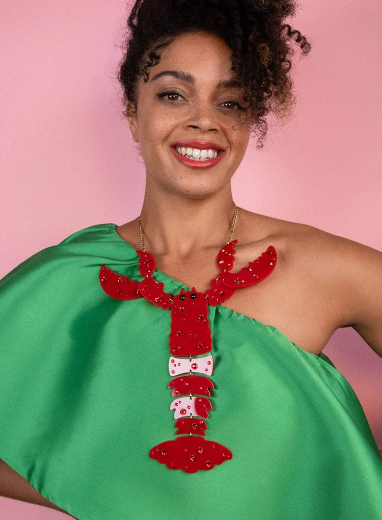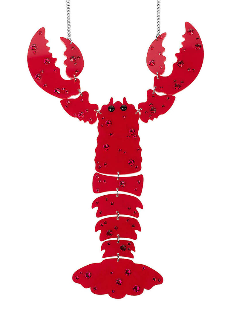 Oversized oceanic accessories, call on our iconic Lobster Statement Necklace. Laser cut in glossy red recycled acrylic, this bold jewellery design was made to adorn dance floors and little black dresses. Embellished with 99 ruby red crystals and articulated to move with you, serve bold styling with this eye-catching red accessory.