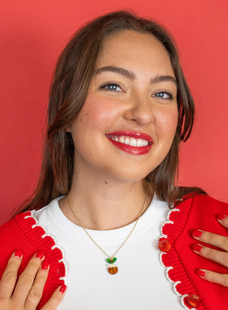 Bring glad tidings with our Mini Christmas Pudding Necklace. Festive desserts meet fun jewellery in laser cut swirling brown acrylic, layered with pearlescent white icing and topped with a sprig of holly. Finished with crystal red berries that look good enough to eat, this Christmas charm jewellery is best paired with a sprig of Mini Holly Earrings.