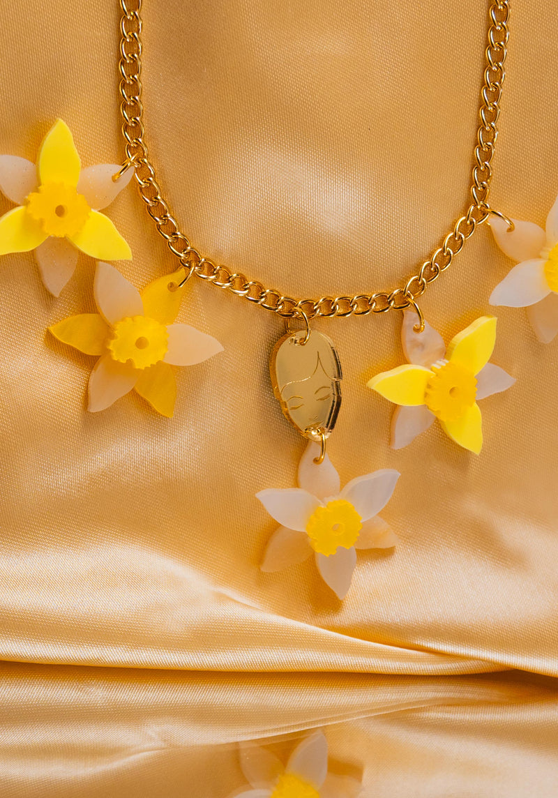 Delicate yet deeply symbolic, our Narcissus Statement Necklace is inspired by the ancient myth of Narcissus, the beautiful youth undone by falling in love with his own reflection. A story of fatal vanity and unrequited love, where the protagonist transforms into the flower that bears his name, the daffodil.