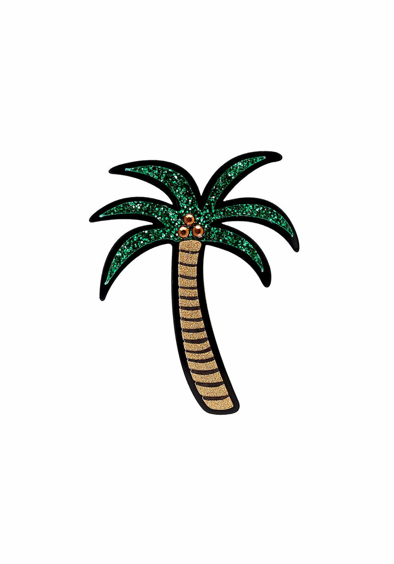 We're all going on a summer holiday... Treat yourself to our sparkling Palm Tree Brooch, recreated in shimmering glitter gold and green acrylic and layered over a glossy black base.