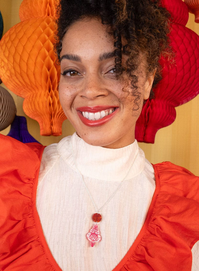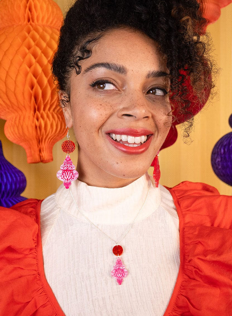 Let there be light with our Paper Lantern Pendant. We have recreated retro-style paper Christmas decorations in a pleasing colour-clashing palette of pink and red laser cut acrylic. Hand-linked by our expert makers, this festive decal is finished with intricate etched, hand-inked details and an adjustable silver-plated chain. Elevate classic knits and go-to festive frocks with this festive pendant now!