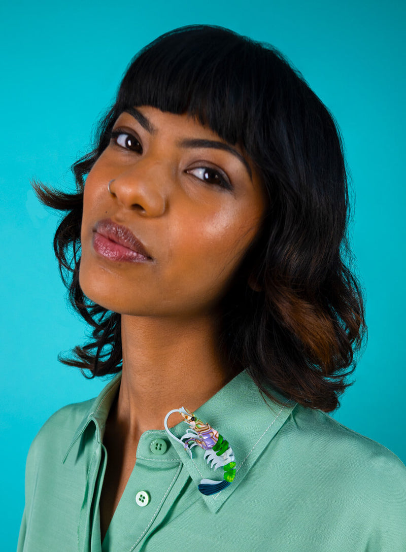 Be a little shellfish in the Pearly Prawn Brooch - Green. Swirled in marine green marble and mirror acrylic, layered over shimmering aqua to catch the sun: this pint-sized crustacean shines with delicate antennae and a twinkling black cabochon eye. Pin to your lapel or go-to knitwear for a touch of oceanic charm.