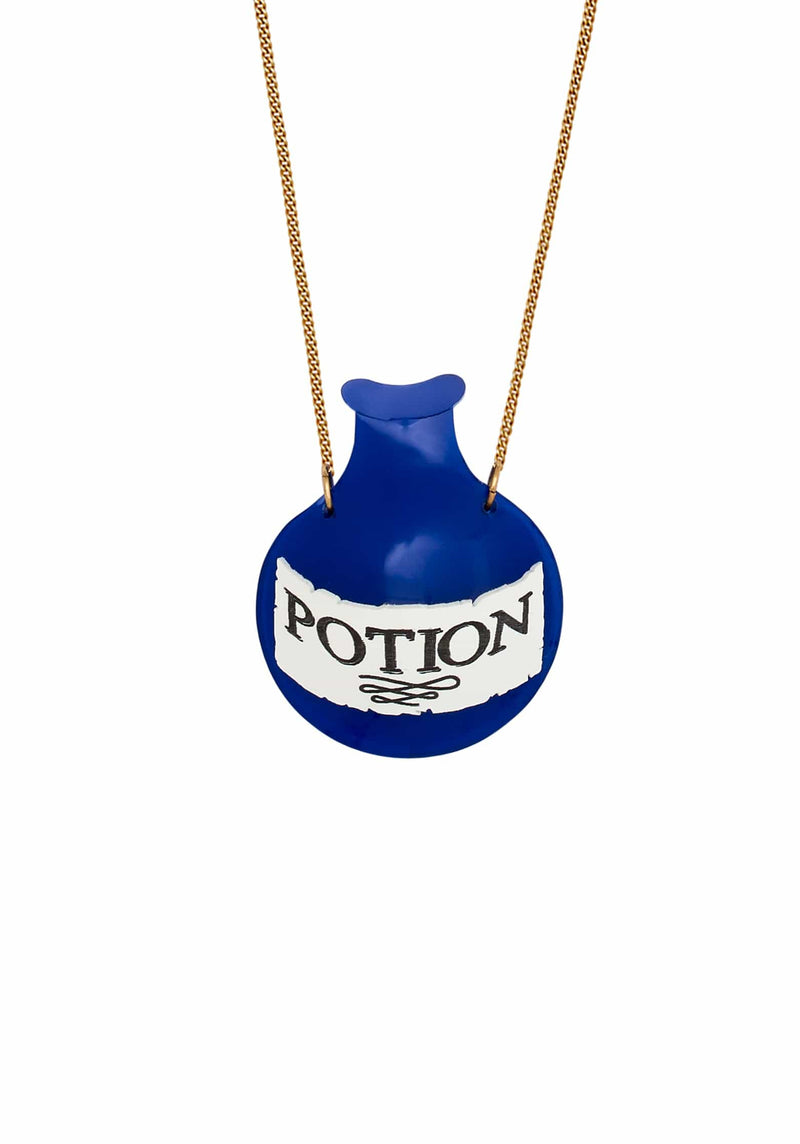 Double, double toil and trouble... Our Potion Bottle Necklace is laser cut from transparent inky blue acrylic, hand curved and finished with a delicately hand inked label. What's your poison?