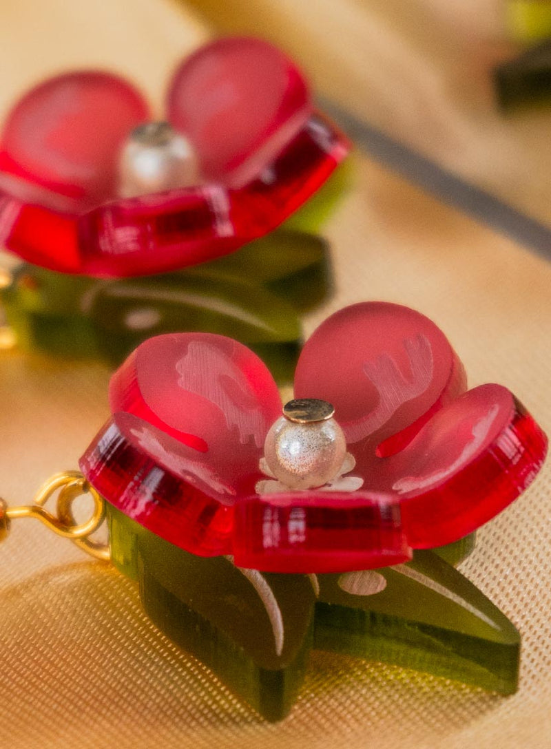 Inspired by Botticelli’s Spring, each earring blooms with frosted fresh green leaves peeking from behind hand-curved, laser cut flowers in vivid berry red. Reminiscent of a painter’s brush stroke, these springtime earrings are etched with floral details and centred with a pearlescent bead, bringing the delicate blossoms to life with subtle radiance.