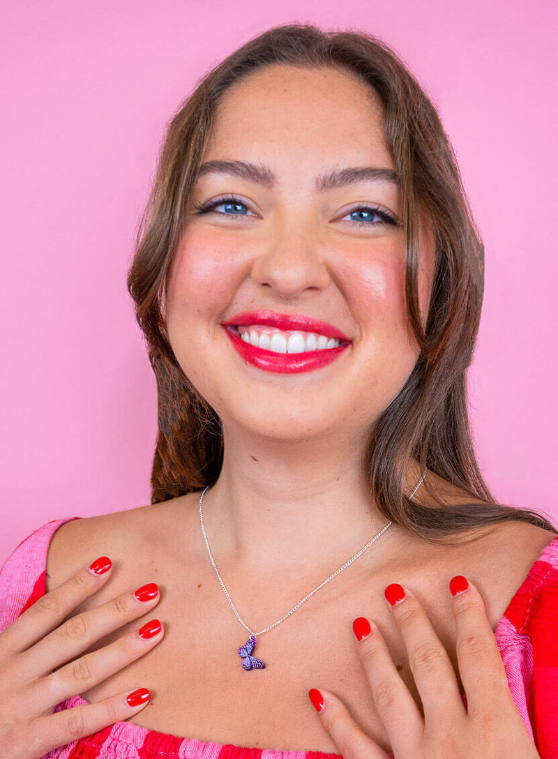 Easy to gift and easy to wear, it’s the Purple Butterfly Pendant. We've transformed a single butterfly into the go-to present for teens and minimalists. Laser cut in deep purple, mirror acrylic etched with intricate wing patterns: this pendant is perfect for layering with classic silver chains.