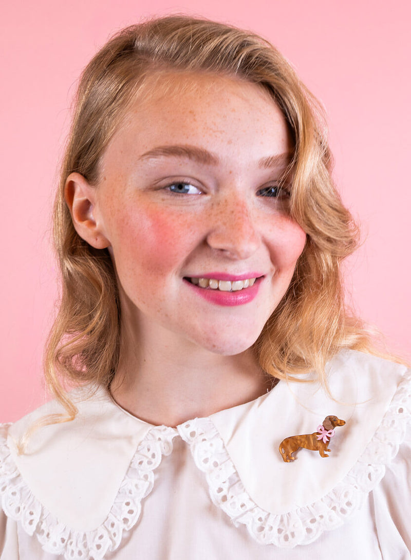 Cute dachshund brooch Original design, handcrafted in the UK Hand-inked detail Wooden ear detail Lightweight and easy-to-wear 10% made from recycled acrylic Presented in an eco-friendly gift box