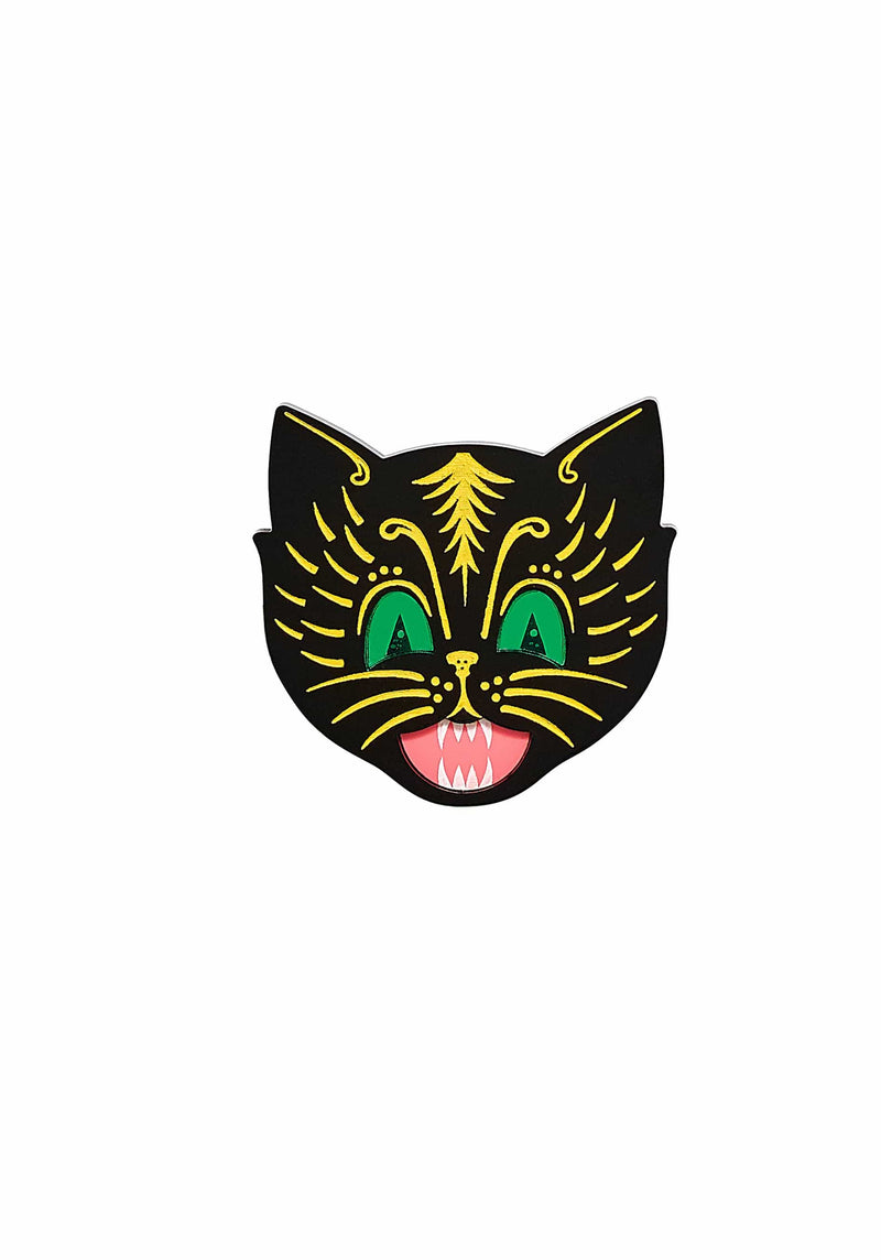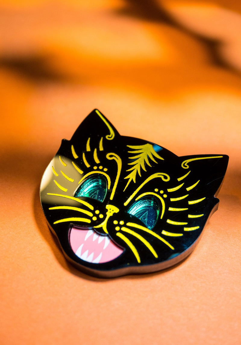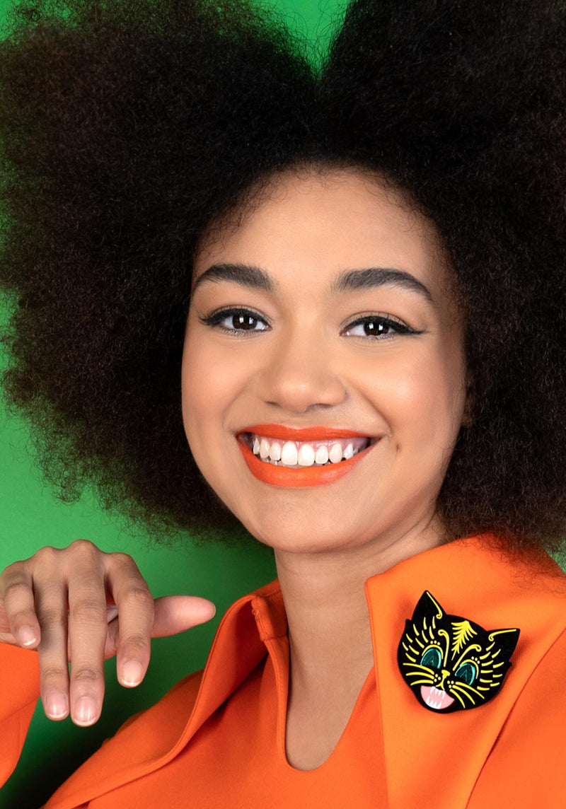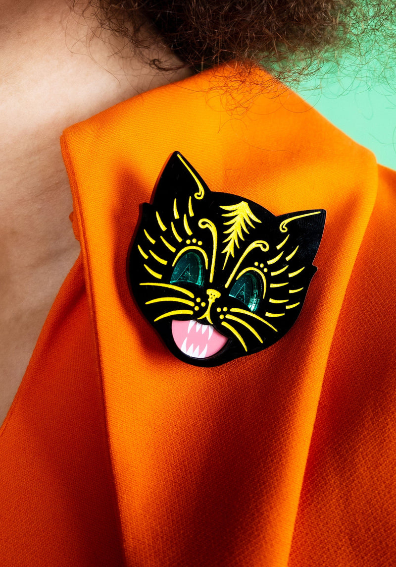 Boo, our Scaredy Cat Brooch is back! We've magicked up a vintage-inspired Halloween cat in layers of glossy recycled black acrylic. A pair of piercing cat eyes dazzle in emerald mirror acrylic, etched with piercing pupils and paired with a petrifying pink yowling mouth. Freaky fur details are etched and hand-inked in gruesome green to bring this fiendish feline to life. Set against a brooch back, pin this piece on a fluorescent faux fur coat for a claw-some creepy look.