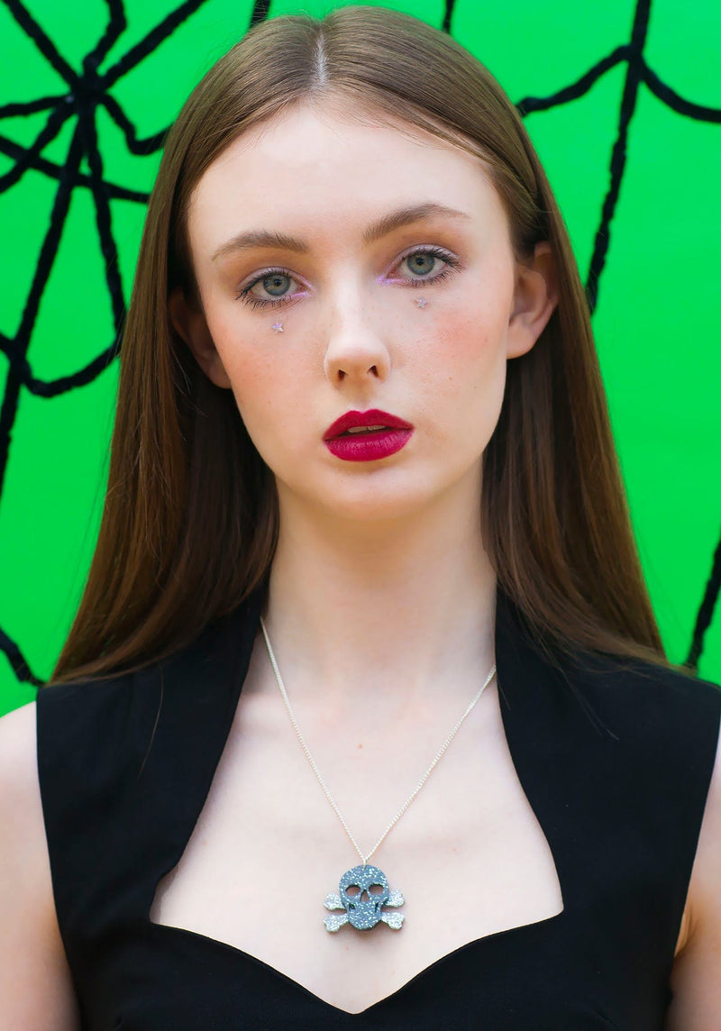 Spooky glittery skull pendant You're in luck, this piece looks perfect! Suspended from an adjustable silver-tone chain Presented in an eco-friendly gift box