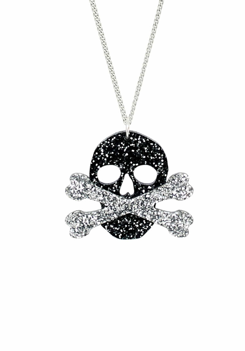 Warning! Let 'em know to keep clear in the Skull and Crossbones Charm Necklace. A laser cut black glitter skull is set against shimmering silver bones and suspended from a glistening silver-tone chain, antisocial accessorising sorted!