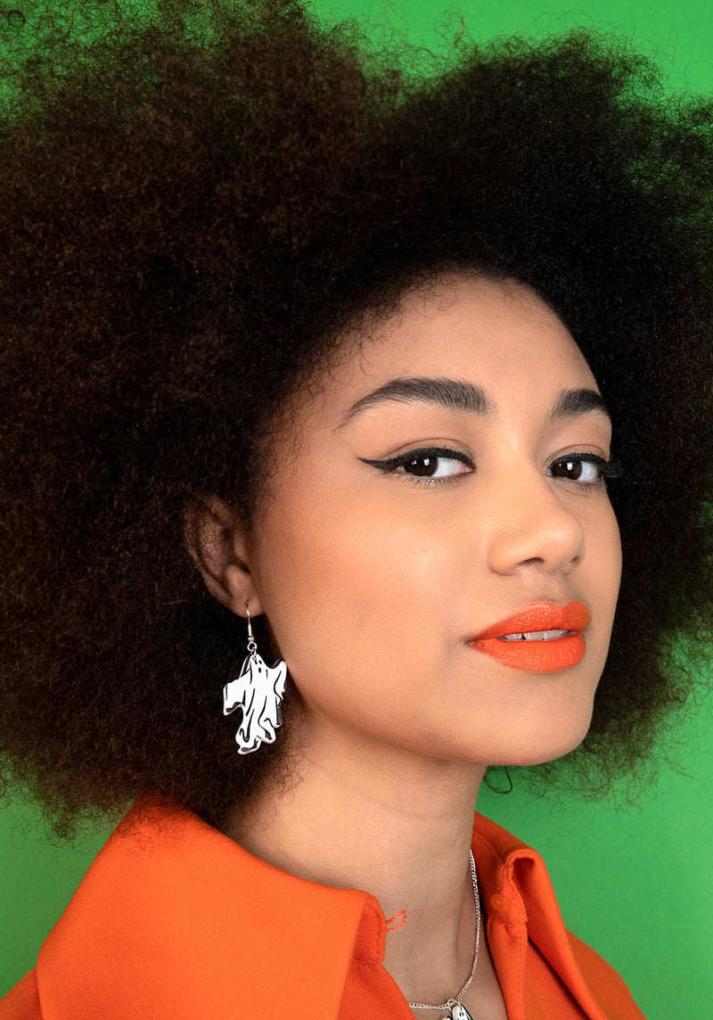 Holy sheet, it's our Spooky Ghost Earrings. We've recreated a classic Halloween costume in 100% recycled white acrylic, laser cut and hand-inked with contrasting black details on silver-tone hooks. It's time for some monochromatic marauding!