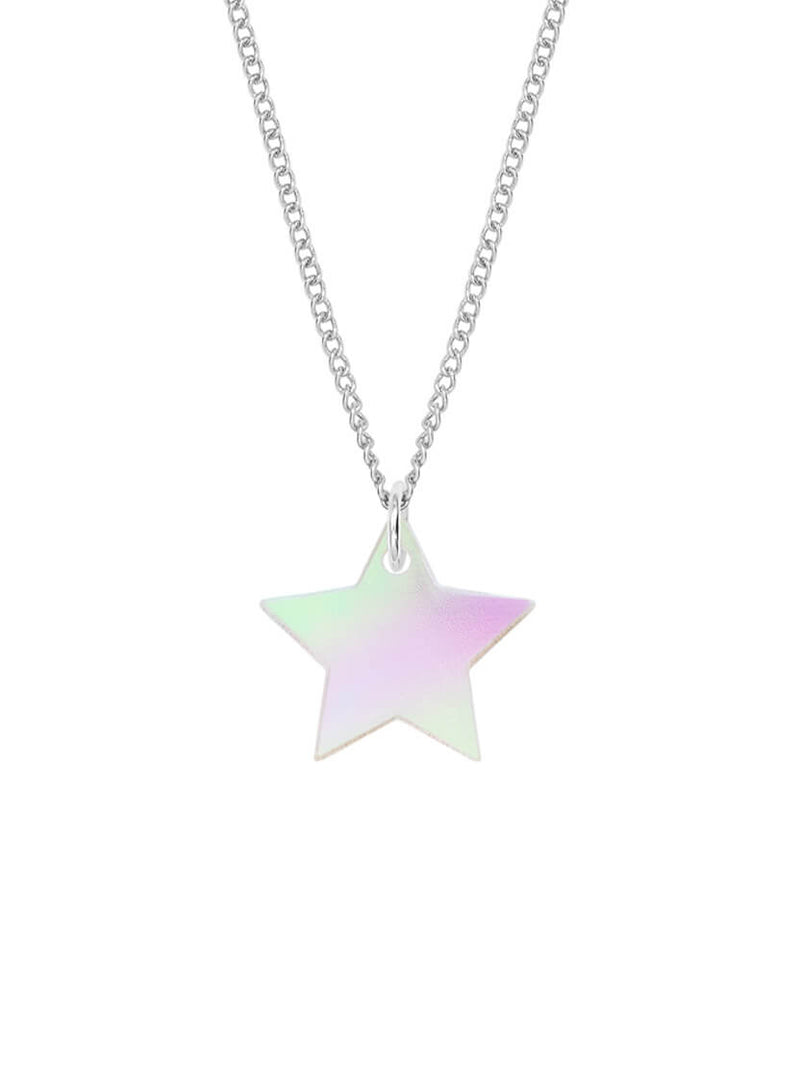 Stargazers, catch a falling Star Charm Pendant. We've laser cut the ultimate celestial necklace in seven intergalactic shades of acrylic. Take your pick from these twinkling tones: sparkling black, gold and blue, glow in the dark pink, colour changing iridescent to dazzling purple mirror. All suspended from your choice of adjustable silver-plated or gold-plated chains, curate your very own necklace stack by pairing with our Moon Charm Pendant and Ghost Charm Pendant.