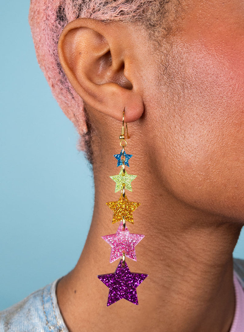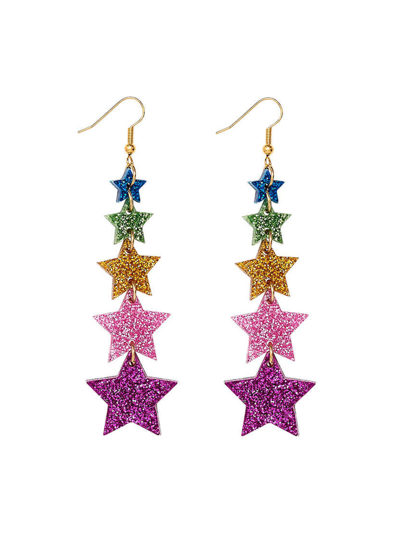 Stellar styling just got easier with our Super Star Earrings in Rainbow. Glittering in jewel tones: five multi-coloured stars are hand-linked in shades of purple and pink to gold and green. Pop in these dazzling drop earrings and hit the dance floor.