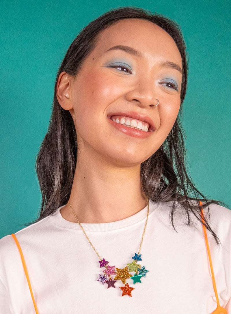 Keep it cosmic with our Super Star Necklace in Rainbow. Reflecting in disco-light shades of mirror pink and green to multi-coloured glitter tones: this easy-to-wear celestial jewellery looks best over graphic band tees to crisp white tee and denim dungarees.