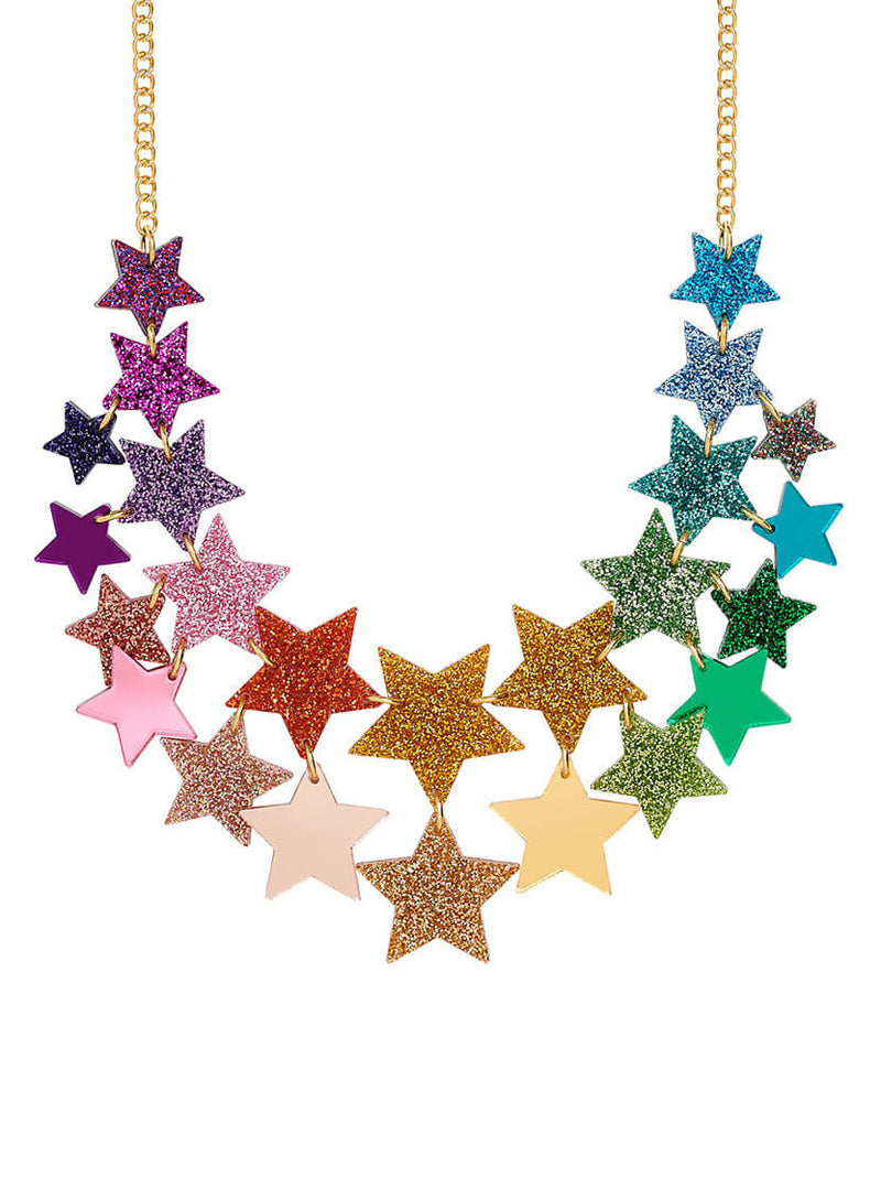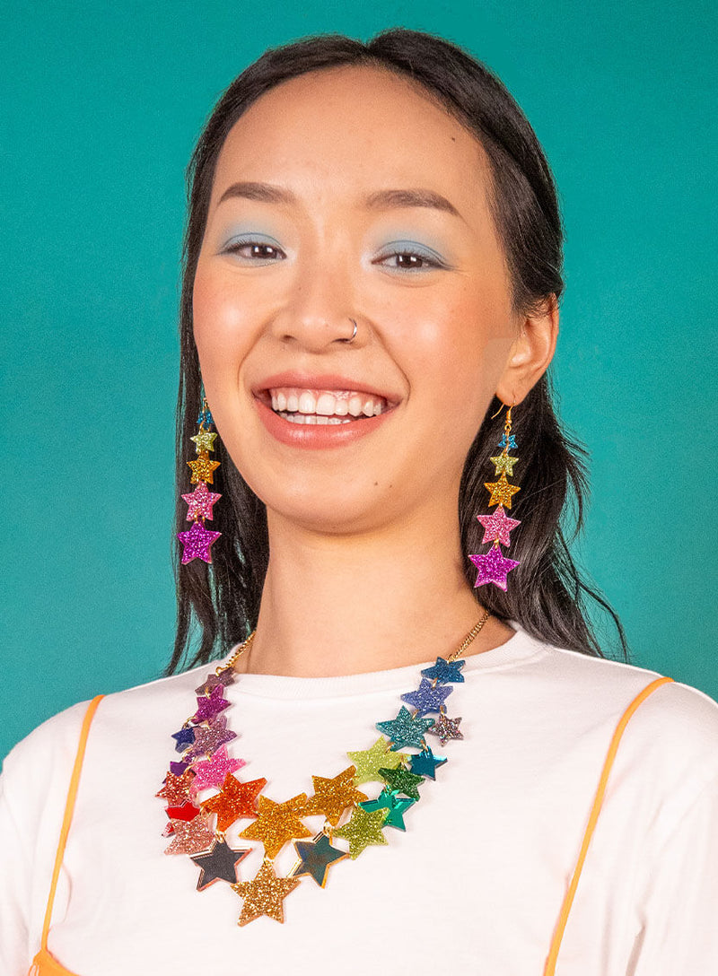 Pop on this party season-essential, the Super Star Statement Necklace in Rainbow. From glistening green to sweetie-wrapper shades of purple, our shimmering star jewellery radiates in 24 rainbow shades of glitter and mirror acrylic. Made to be worn with shiny, jewel-toned dresses to classic LBDs: nail cosmic cool with this occasion necklace.