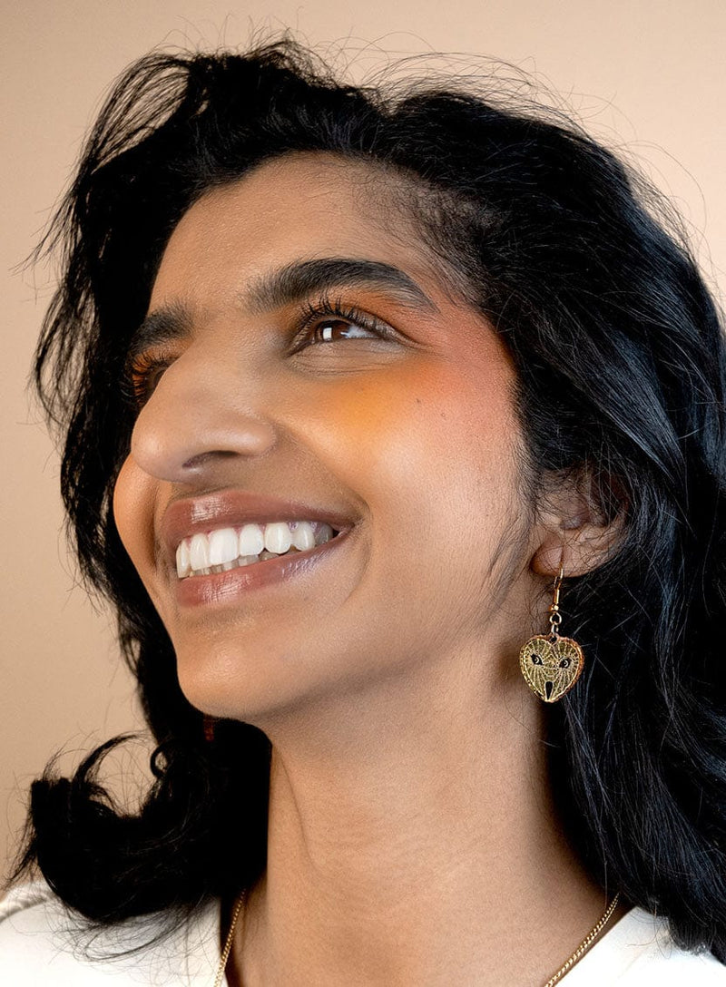 Cor, what a pair! It's our Tawny Owl Earrings. We've recreated a pair of heart-shaped hooters in glossy gold mirror acrylic, etched with feather details and a wise visage. Layered over laser-cut walnut wood with an undulating outline, our picks of the parliament are suspended from hypoallergenic gold-tone hooks. Let's have a hoot!