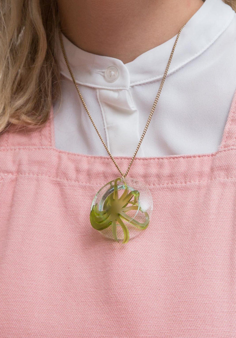 Sun yourself in the Terrarium Necklace. Translucent green leaves creep outside a hand curved transparent acrylic terrarium. The best bit? Suspended on an adjustable gold tone chain, this portable plant goes wherever you do!